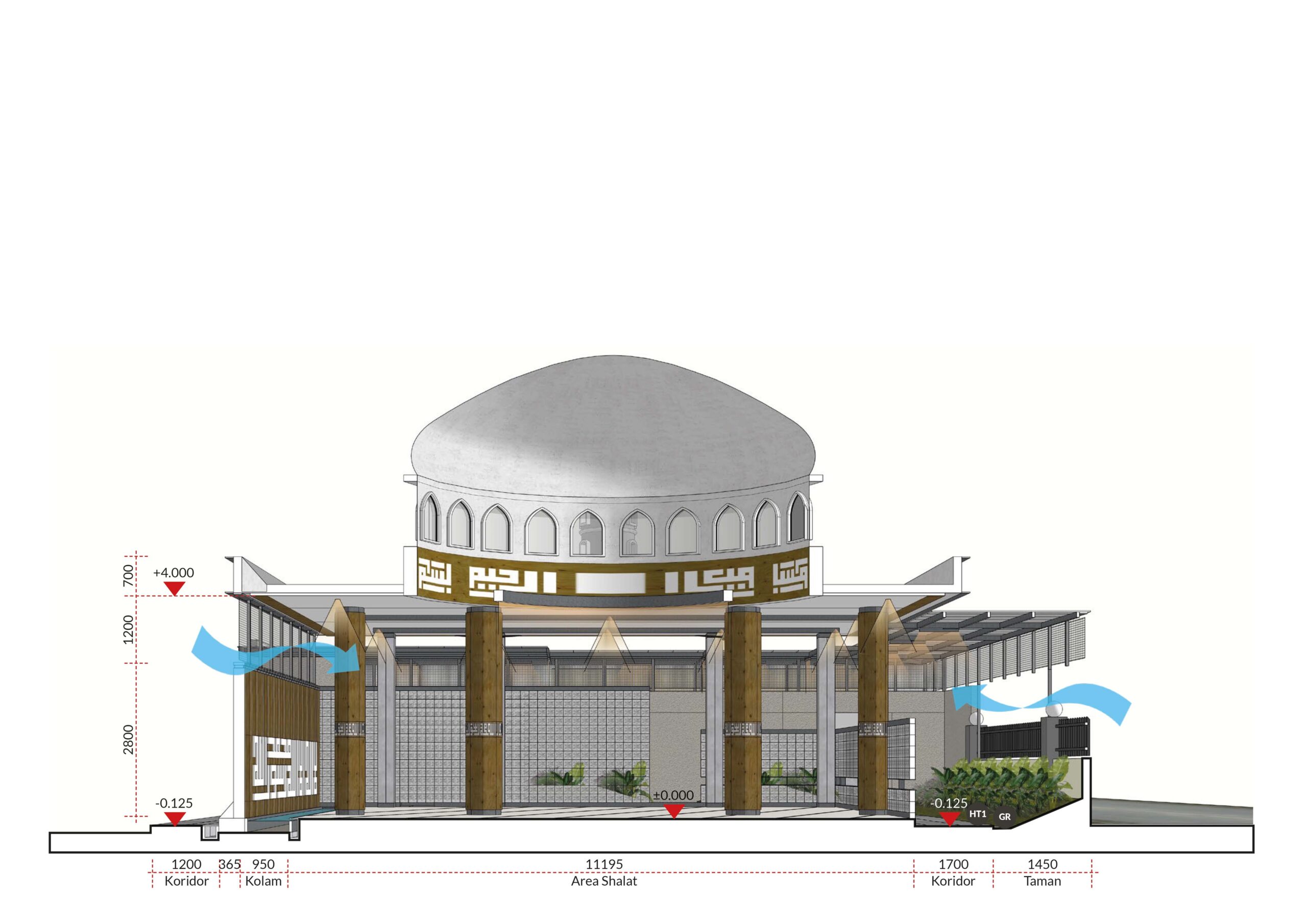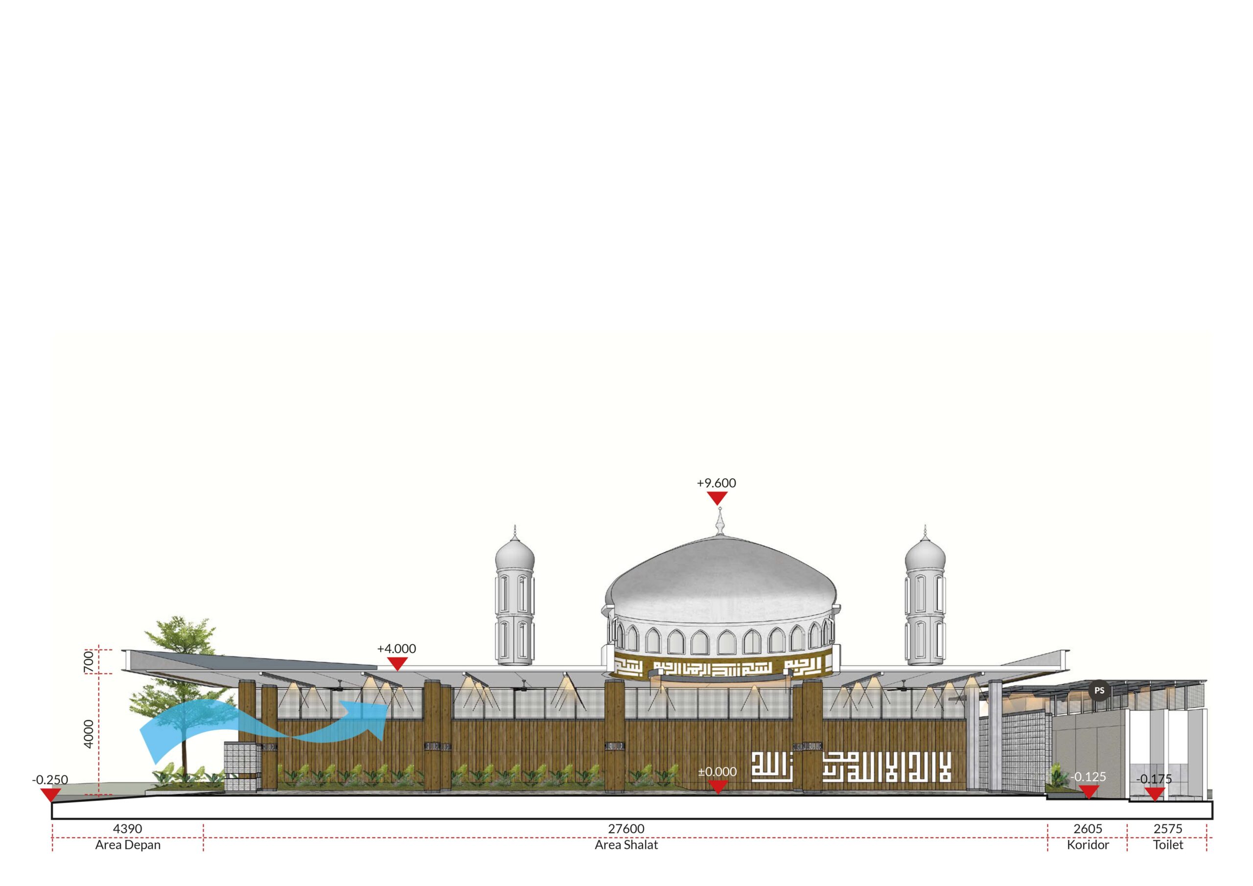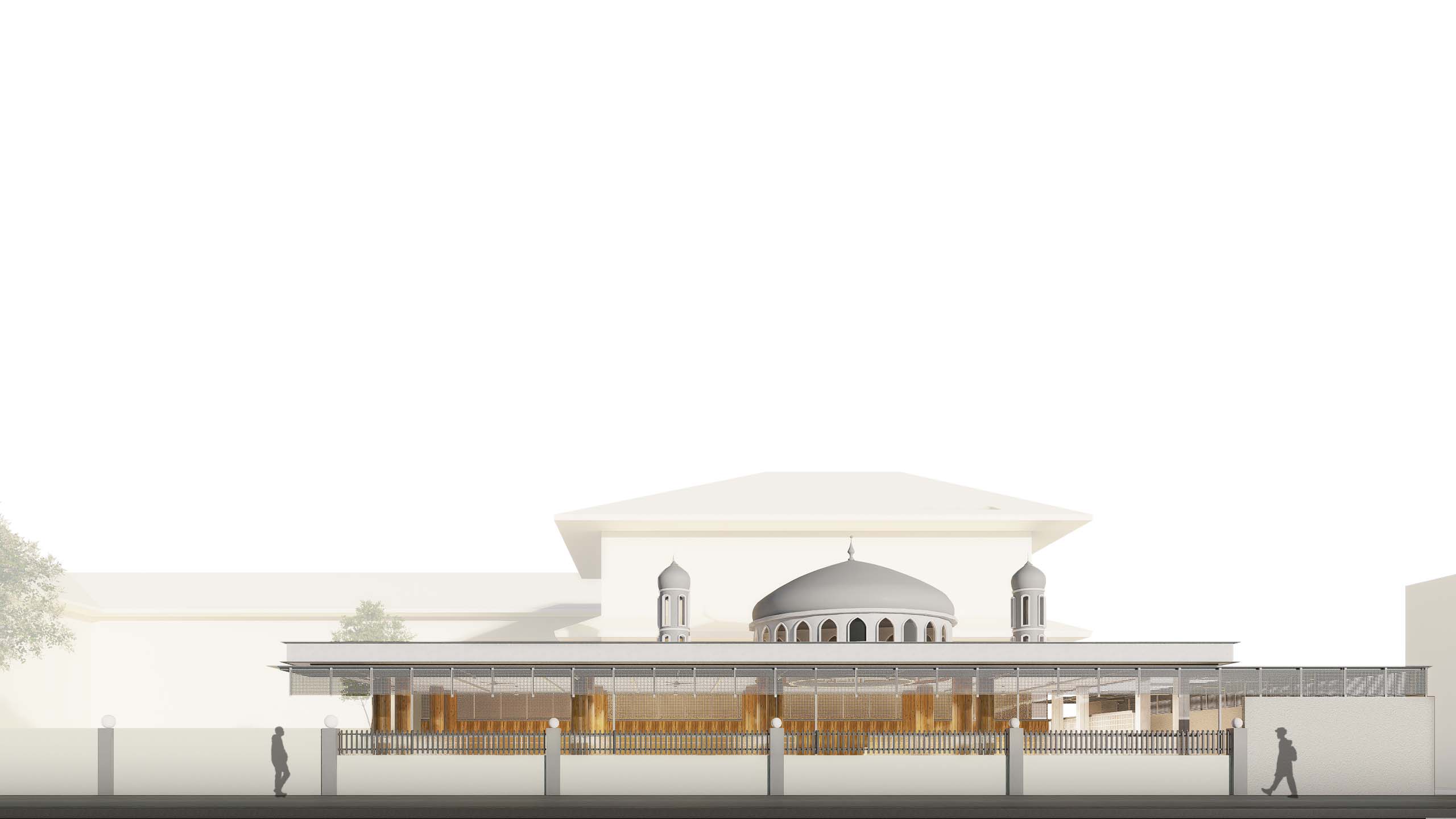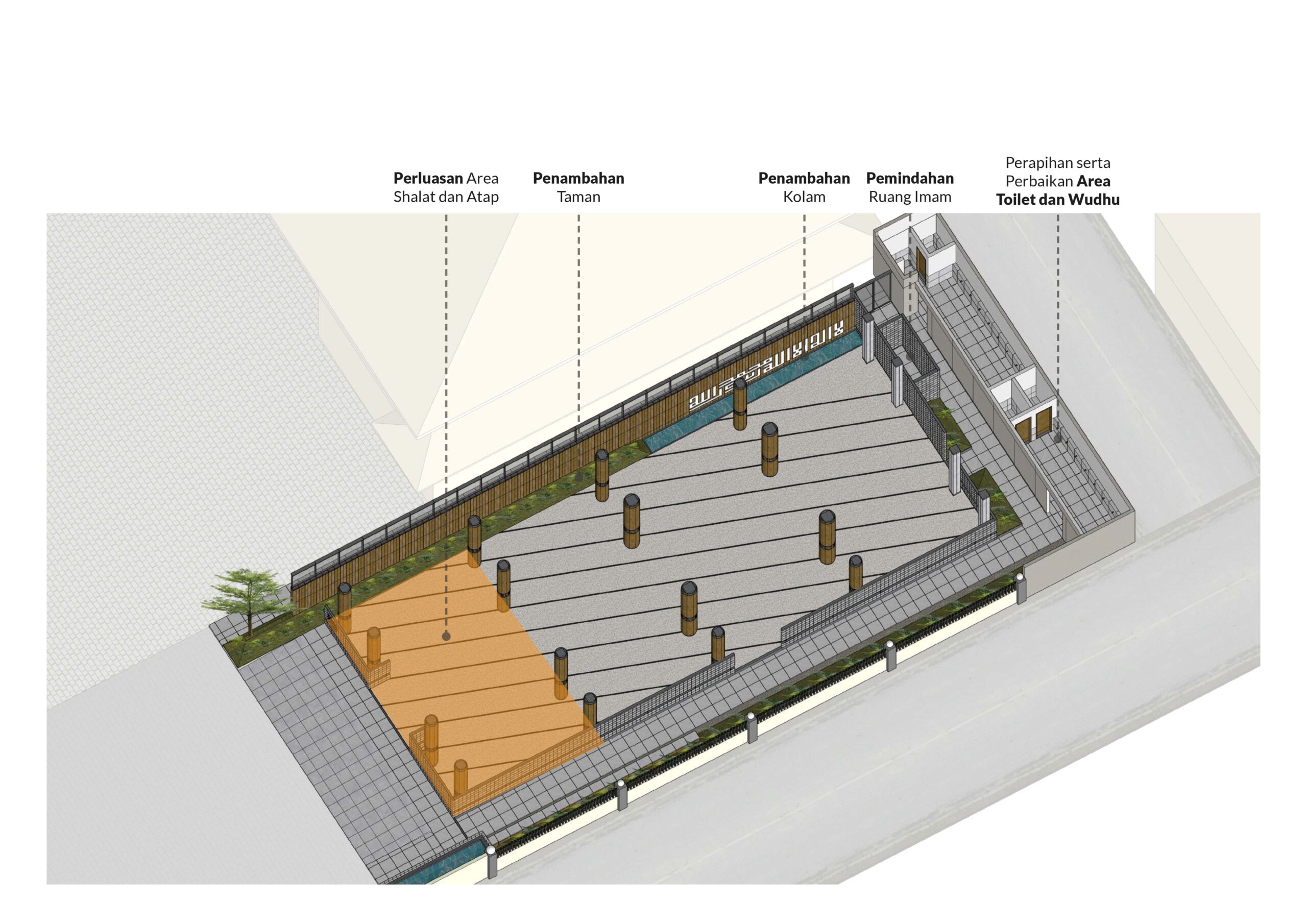 The renovation aims to enhance the mosque’s capacity and overall spatial quality. Key strategies include expanding the area towards the school’s field, reducing solid walls in the central prayer area to create a more open space, and upgrading supporting facilities such as restrooms and ablution areas to improve congregant comfort.