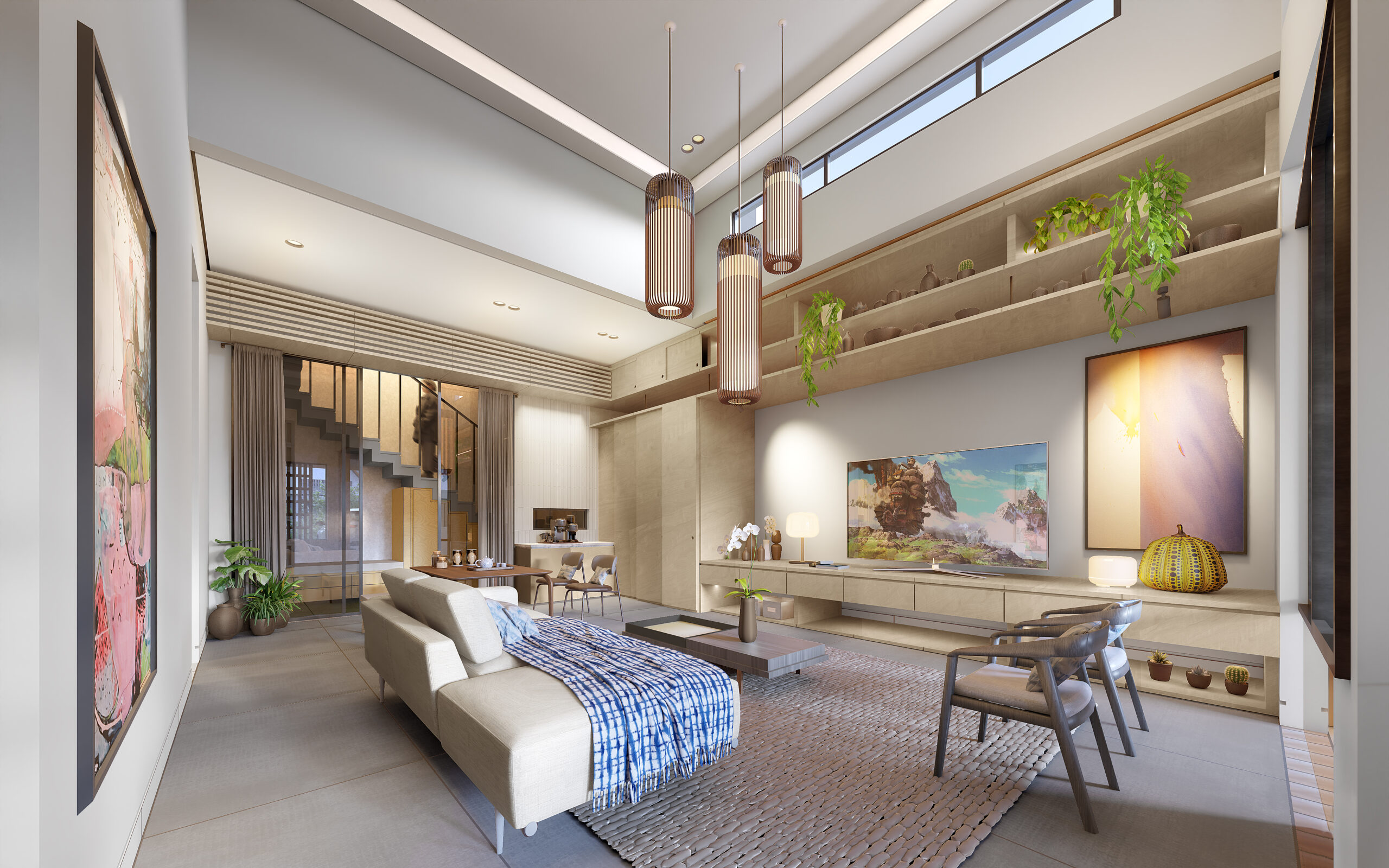 The first floor accommodates the primary living functions of the house. Upon entry, the carport leads to a welcoming living room that is seamlessly connected to the kitchen and dining area, fostering a sense of openness and fluidity. This level also includes a master bedroom with an en-suite bathroom, two additional bedrooms for children, and a shared bathroom. The inner court garden not only enhances the aesthetic quality of the interior spaces but also acts as a natural ventilation shaft, supporting the tropical living concept. A high ceiling is introduced in the main living areas to facilitate better airflow and reduce indoor heat accumulation, further emphasizing the house’s environmentally responsive design